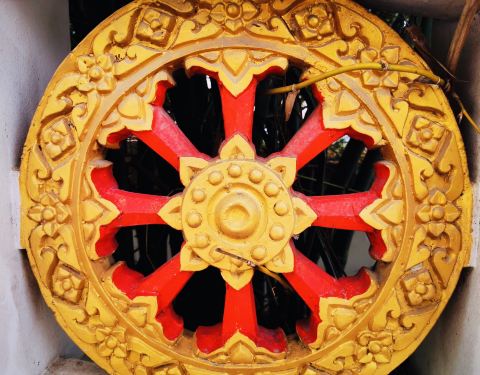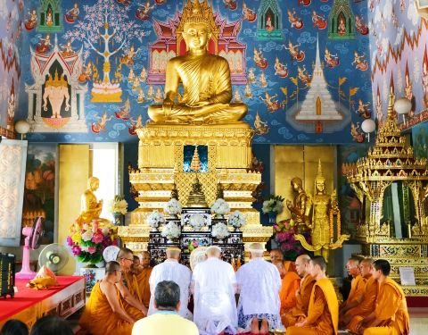 克拉瓦兰佛寺的入口周围有金色龙的楼梯,寺庙外面有复杂的白色细节, 里面的空间很小,墙上有壁画,有红地毯座位的高架平台,这是和尚通常坐在那里盘腿祈祷并给予祝福的地方。