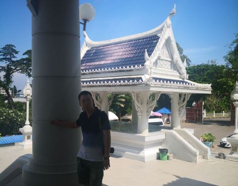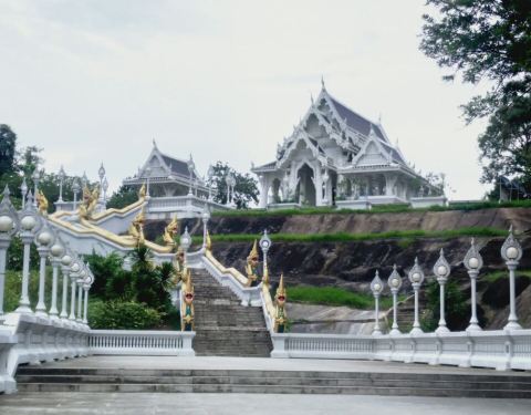 打车从甲米奥南的海滩边到甲米小镇,然后晒着太阳一路,沿着街铺,穿过小道,走上桥以后来到寺庙。走路的时候可以看看周边的风景,也不失为一种乐趣。 桥的那段走得稍微有点吃力,因为是克服重力做功吗,总体来说除了太阳暴晒以外其他都还好。 三舅看到了非常宏伟的一个建筑,白色的跟曼谷清迈那种金灿灿的寺庙比起来有它的独特性,但是跟清莱白庙比起来好像又有点不同。 门口有白鸡和黑鸡,灵活自由的走动。还有和尚等,当日穿了一条西短,所以不适合进寺庙参观了,只能远远的看看。下去应该有一条直通大道,但是我们绕了个远路走的,直通大道的话后来也路过,从下往上看和从上往下看的感觉略有不同。