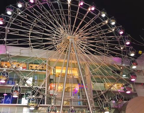 购物中心在三越百货公司的对面,最嘱目的是商场楼外的摩天轮,想玩就要从商场上三层进去。但整个商场的商店不多,从扶手电梯上两层是一家精品店,都是年轻人的东西,其余都没什么逛。