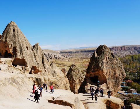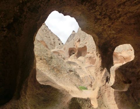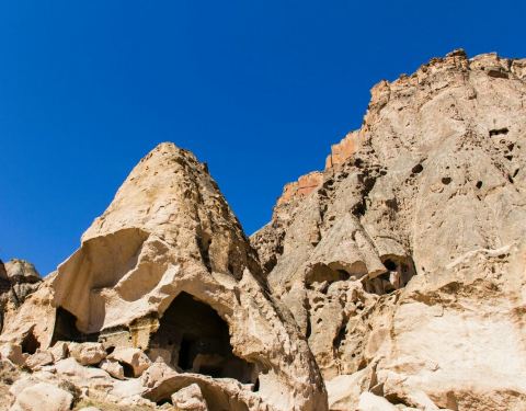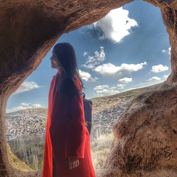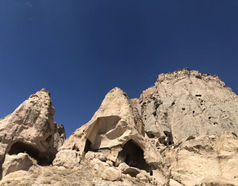 塞利梅修道院建在一座石山内部,想要看修道院就要先爬上去。虽然卡帕多奇亚“盛产”这种石头里的建筑,但是塞利梅修道院还是有着别具一格之美。这里因为酷似《星球大战》中突尼斯的土洞屋群外景地而闻名,山岩上寸草不生,远远望去像是一只千疮百孔的庞大外星生物,怒发冲冠并将触角伸向四面八方,让人顿生畏惧。因为没有路,需要手脚并用才能爬得上去,阳光将山体染得金光刺眼,更增加了不少挑战。一小队人马像是行走在外星球的探险家,不知前方等着自己的是何惊涛骇浪的景象。