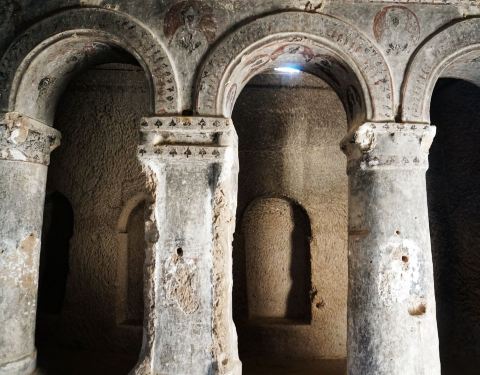 严格来说,这是洞穴中的修道院,但修建的与地面上的教堂一样,有罗马柱,有壁画,放在当年,也一样的庄严肃穆。来到这里,你会惊叹古人的智慧与能力,竟让一座光秃秃的山头的内部互联互通,充满生机。