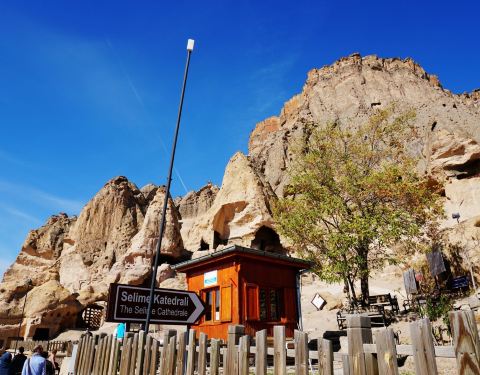 塞利梅修道院建在一座凝灰岩石山内部,想要看修道院就要先爬上山去塞利梅修道院建在一座凝灰岩石山内部,想要看修道院就要先爬上山去。因为以前是骆驼道,窄而陡更增加了难度,有些时候需要手脚并用才能爬得上去。修道院规模很大且保存完整,令人想到当年時修道院是如何宏伟。