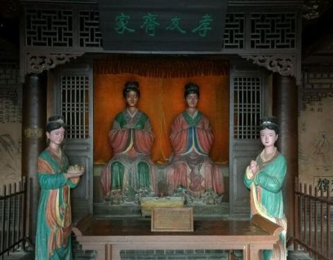 娥英祠,这是济南的名胜之一。娥皇、女英是尧帝的女儿,二人同嫁给舜。姊姊为后,妹妹为妃,三人感情甚好,她们曾经帮助舜成功地登上王位,事后却鼓励舜以德报怨,宽容和善待那些死敌。她们的美德因此被记录在册...