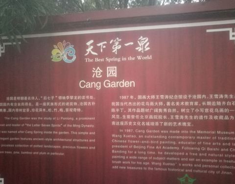 沧园,在济南天下第一泉风景区—趵突泉公园的东南部,是一处园中之园的传统庭院式建筑,大门朝西沧园,在济南天下第一泉风景区—趵突泉公园的东南部,是一处园中之园的传统庭院式建筑,大门朝西。沧园,取沧海一勺之意。其地在明、清两朝原为一书院的故址,清末以后屡次改为学校。