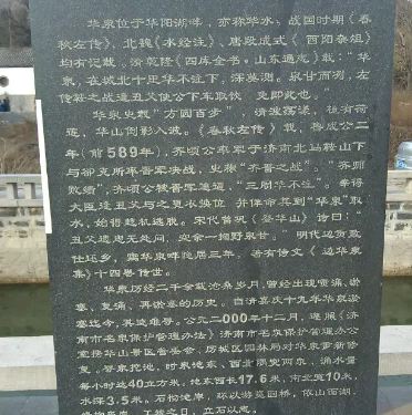 位于华山(古称“华不注山”)南侧山脚下,也称华水,因华山得名。战国时期的《春秋左传·成公二年》即有记载。北魏《水经注》亦载:华泉,在“华不注山下也”。元《齐乘》说:“山前道院中有石刻太白诸贤诗,院前...