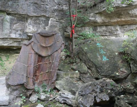 灵岩寺景区靠近门口的地方,有山泉水从岩缝咕咕流出,不知何年何月,一件铁质袈裟立于泉边,得名袈裟泉