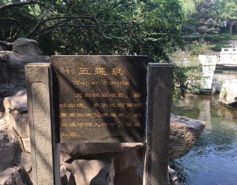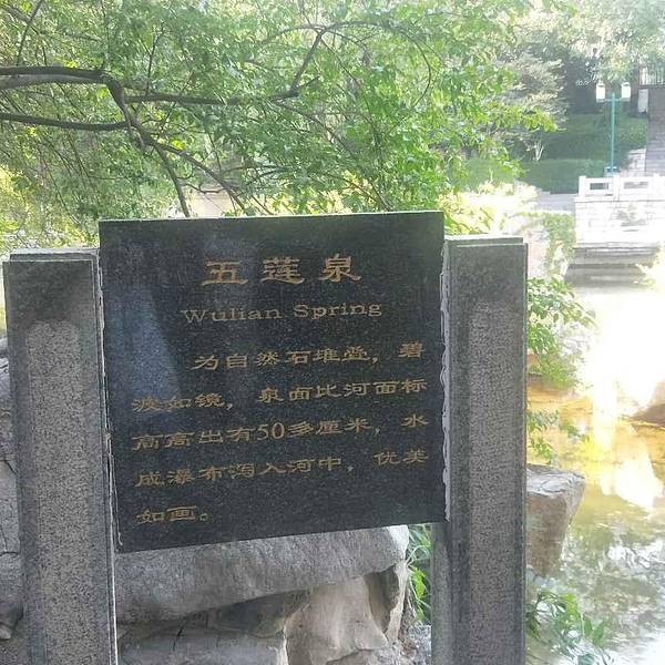 此泉在琵琶泉西侧、任泉和南珍珠泉之间,为黑虎泉泉群的14处泉池之一,但其实它并不列入七十二名泉之内,泉名是由当代著名书法家马子恺题写。 五莲泉的泉池高出河面,池底泉眼甚多,较大者有五个--水泡成簇,升于水面绽裂开,溢出池外,好似五朵莲花盛开,因而得名。 因泉池高于水面,故泉水趟入河中、泉河相叠,绿波流水涌细浪,流中有泉,泉中过水,正所谓泉河相依是也~