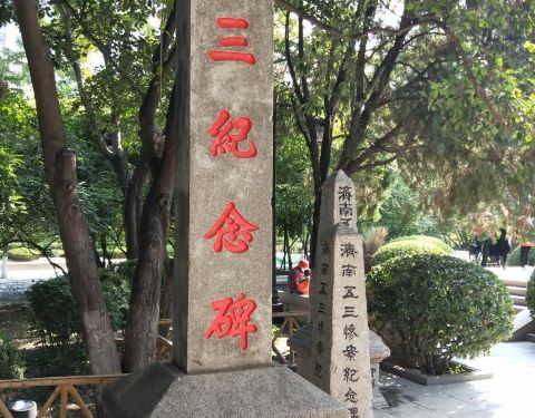 五三案,是济南这边当时近代的一个大事件,纪念碑就在事件的纪念馆旁边,总共是有四块,其中最显眼的那一块是红字的。 另外的两个就是方尖碑的形式存在,具体的历史事件可以进去纪念馆里面看一下,进去之后还是蛮多人的,很多图片。