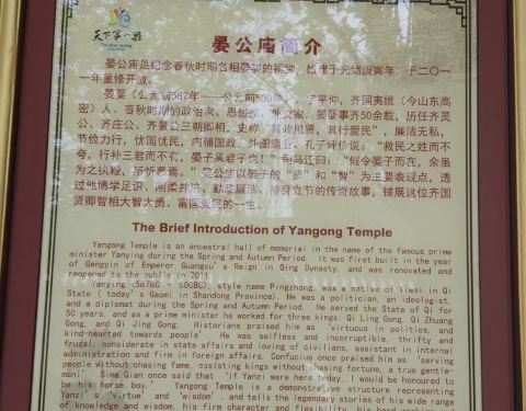 大明湖畔有座晏公庙,院落不大,厅堂面阔三间,进深两间,青石灰瓦,彩檐斗兽,气派非凡。门口“晏公祠简介”内容是:晏子,名婴,字平仲,春秋战国时期齐国夷维(今山东莱州)人。事齐五十余载,历任齐灵公、齐庄公、齐景公三朝卿相。