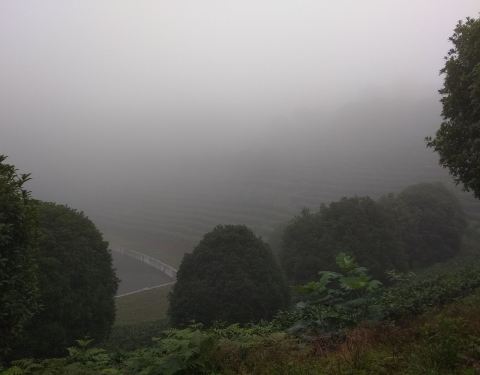 广西阳朔七仙峰茶场是一个以梯田形式种植的茶树,层层梯田的茶树绿绿葱葱,那一天淅沥下雨,在雨雾中一眼望去茶叶油绿还有点点水滴,非常好看。