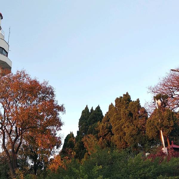 烟台山景区是免门票的。 我们从张裕博物馆门前骑共享电动车,穿过一片老式洋房之后,大概十分钟就到了烟台山。 烟台山并不高,秋天的树叶有红有黄,配上老洋房的红瓦白墙,很有深秋的感觉。一直走到最后是英雄纪念碑和灯塔,上灯塔要10块钱(电梯)的费用,强烈建议要上去,站在灯塔上远眺,海港、海岸、市区,绝对美丽!