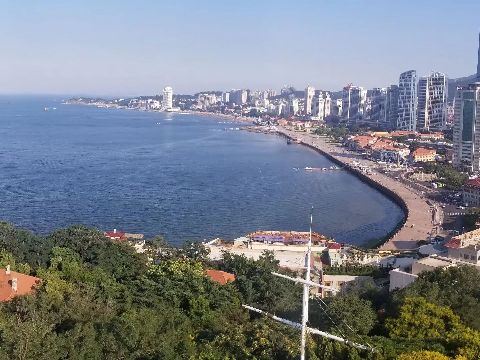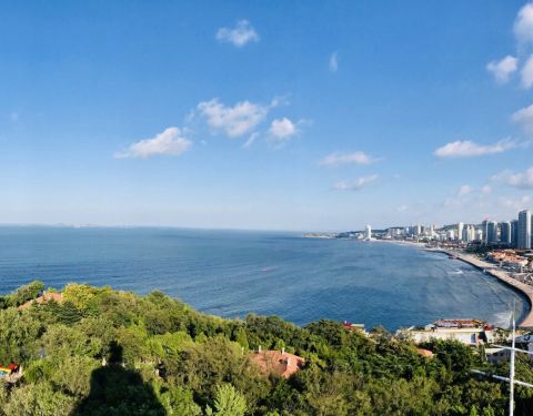 烟台很漂亮的现代建筑和碧蓝的海岸线相结合,蓝天白云,海水碧绿。不过附近没有沙滩,所以浴场比较差
