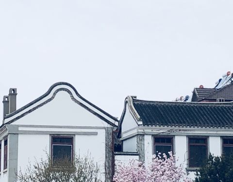 我们从张裕博物馆门前骑共享电动车,穿过一片老式洋房之后,大概十分钟就到了烟台山。