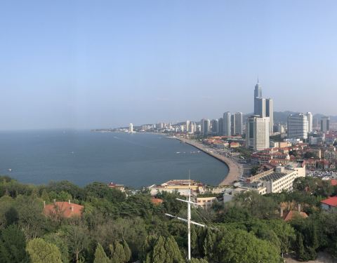 在烟台山上面有一个显著的大灯塔。 好像是10块钱可以坐电梯上去观看周边的风景。 烟台很漂亮的现代建筑和碧蓝的海岸线相结合,蓝天白云,海水碧绿。不过附近没有沙滩,所以浴场比较差。