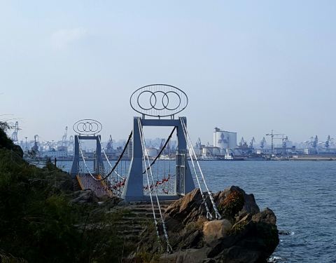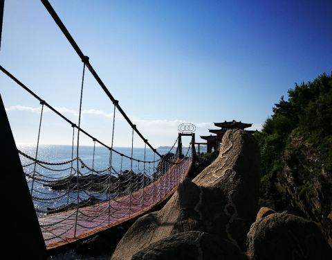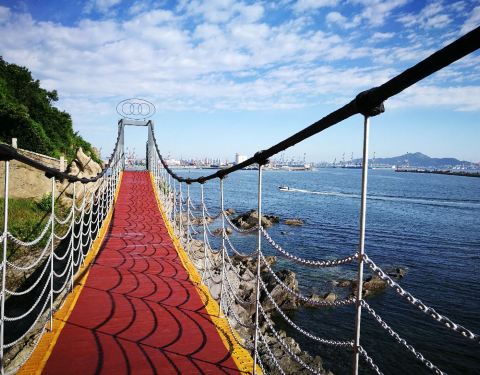 位于烟台山景区内海岸边的礁石之间的一座吊桥,当地人叫它情人桥,经常有新郎新娘到这里拍婚纱照,挂同心锁,这一带海岸礁石林立,环境优美,是看海听浪的好去处。