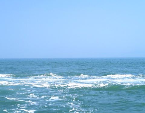 到八仙渡海口时间已是不早,导游给我不多的时间游玩,里面有个乘快艇出海看黄、渤海分界线的项目,我们都参加了。以前在一个海边人的博客里看到黄、渤海分 界的图片,今天终于有机会亲临现场了。雅马哈的快艇速度真的可以,而且船长故意大转弯,故意晃动船只,很是刺激。到了分界线,船长简单说了一下,他说他的 船头在黄海,船尾在渤海。