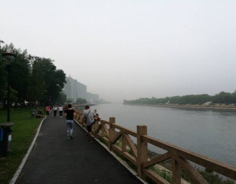 珍珠公园就在鸭绿江边,公园绿化很好,很干静,空气清新,适合老中青所有人休闲、健身,还有蓝球场,许多年青人在打篮球,还有一队健走团,在音乐声中雄纠纠的走了一圈又一圈