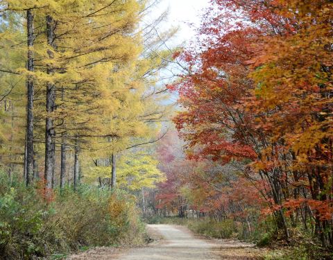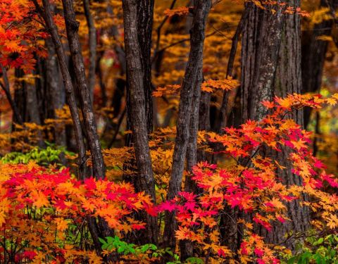 树木非常多植被丰富,觉得是秋天的时候最美丽,树叶有金色,黄色,绿色,红色等,是多彩的树林