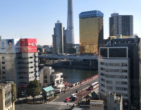 和雷门隔路而望。一个有意思的建筑。一楼提供免费咨询和地图。有会中文工作人员。我们爬到顶楼,这里是个从高处拍浅草寺和晴空塔好地方。对了,这里的卫生间提供消毒液,可自行消毒马桶垫,为我们女士解决了一个麻烦。