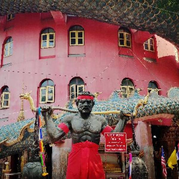👍特色推荐: 距离曼谷60公里外,有一个佛统府,是曼谷周边游的好地方。这里有一座鬼斧神工般的寺庙成了大家向往的打卡地,那就是——Wat Samphran 蟠龙庙🐉。从神秘的巨龟嘴巴进入隧道,出来不远就能到龙庙脚下。这是一座17层高的粉红色圆柱体楼,每一层代表着不同的境界,一头青褐色的巨龙盘旋在楼上,既神秘又壮观。龙身是漏空的,沿着龙身可以一路爬到顶楼,上面是就是龙头所在之处。将祈福的红带系在龙下巴下,就能实现你的愿望。在龙顶上,可以俯瞰整个佛统府,十分有意思。 🚕交通攻略: 除了自驾或包车以外,也可以从曼谷乘坐火车一个半小时到达佛统府,再乘坐402路公交车就可以到龙庙附近了。 💰人均消费: 火车票14泰铢,公交车票20泰铢,龙庙无需门票,自愿捐赠做慈善 🌟实用tips: 在龙庙旁边,还有一座大佛像,观音像、象神等神灵供台,想祈福许愿的,都可以去哦,据说还是挺灵验的。 另外是寺庙,禁止穿短裤、短裙等服装入内,一定要注意自己的着装以示尊重哦。