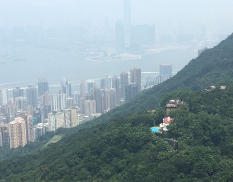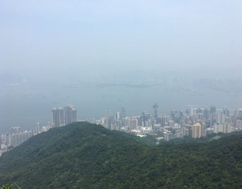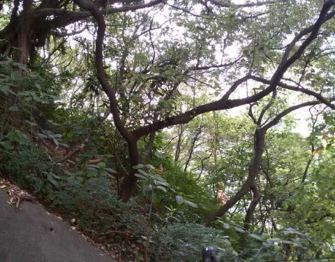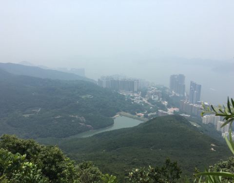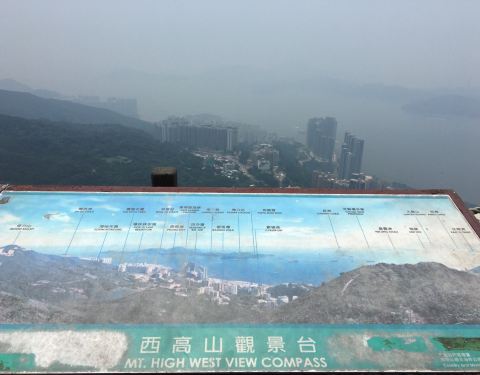 在中环交易广场搭巴士来到山顶,山顶环形步道有两个方向,走卢吉道会比较远,走夏力道前往西高山会比较近。从夏力道的入口大概走一公里会看到一个休憩花园中的凉亭,这时候就离开夏利道的主干道,往小花园深处走。没有标志,反正看到一处小台阶下几阶下去就能够看到爬山的路了,这边是通往西高山观景台的唯一去路,原路上也只能原路下,这一小段大概要半个小时,其实是蛮吃力的。在闷热的夏季满脑门儿的汗,大颗大颗的往下滴。当天雾气太重,在西高山观景台,只能看到下面的薄扶林水塘,和玛丽医院附近的海景,看对面的南丫岛的三根烟囱只是模模糊糊的影子而已。