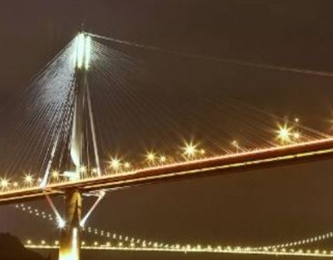 汀九桥,世界首座三塔式斜拉索桥,由德国工程师设计。位于新界青衣西北角,帝景酒店的窗外