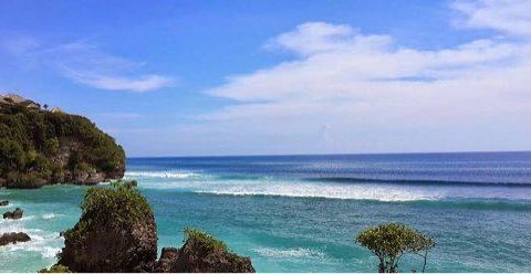 巴厘岛宾垦海滩不是有很多细沙的沙滩,不过总体来说还是可以的,总体来说值得去的,海景还是相当不错的,有山有海有风景,海天一色。