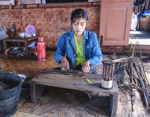 这是一个水上的村子,得益于这一片旅游的开发,这个村子里的人已经做起了游客的生意,他们会向游客展示这里手工制作卖一些手工艺品。人还挺多。