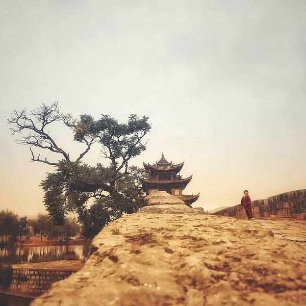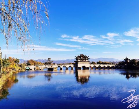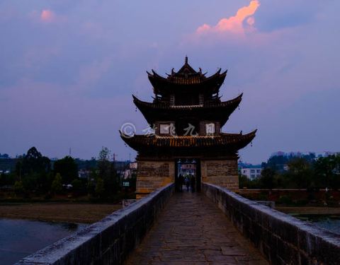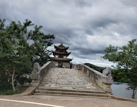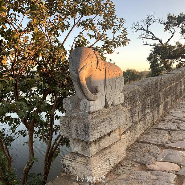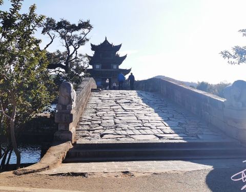 还有座双龙桥,最适合日落观赏。离吃饭还有段时间,我驱车向城外开去。 对双龙桥的第一印象是油亮的石板,和桥头被摸得光滑的象身。踏上拱桥,眼前一座庄严精致的飞檐楼亭,走进楼亭是漏窗屏门,镂空花卉,相当好看。慢步走着,才想到日落观桥,应该是远观才对,难怪我什么也看不到。赶快跑下来,还来得及,太阳刚落半山腰。 夕阳照在整个楼亭上,像打了一束聚光灯,不是暖橙色,而是真正的赤金色,璀璨夺目。岸边很多人都举起手机,记录这一瞬间。 金色一点点褪去,最后变成完全的银灰色,可刚刚的一刻仍旧让人回味,心满意足。建筑之美是永恒的,但加上阳光、天气,就成了不可复制的瞬间之美,因为短暂、不可轻易获得,而似乎更接近美的本质。【推荐指数】:★★★★ 【小糖Tips】:可以在天气预报里看当天日落时间,太阳落下去就不太好看了。