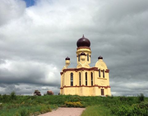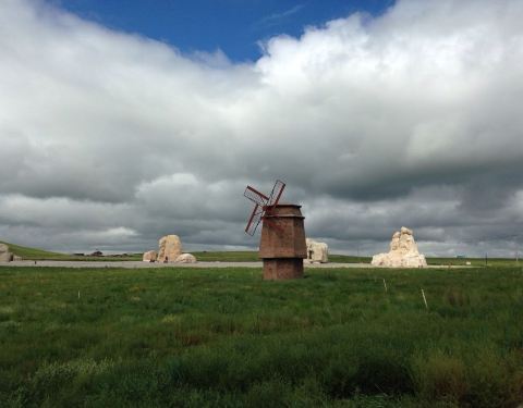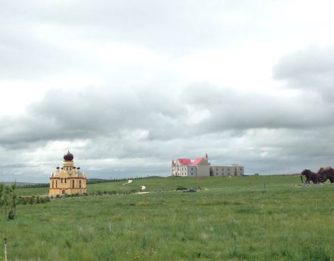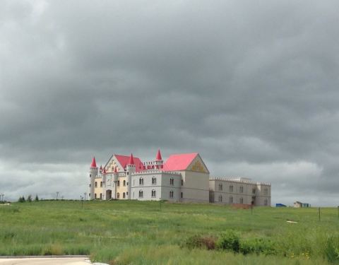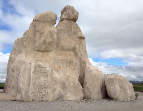中蒙俄三国交界的草地平原,非常开阔,头顶是蓝天白云,中间矗立着一座巨大的情侣石雕。情人岛在地势高的地方,能俯瞰全城并且看到远处的俄罗斯城镇。