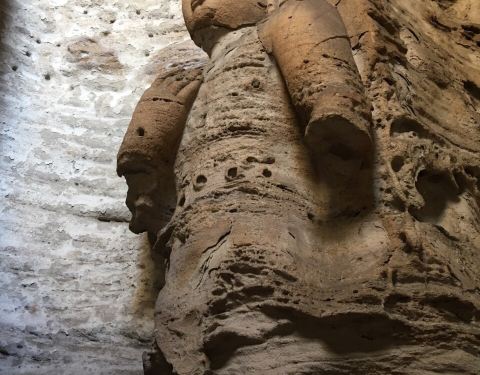 中层的三个天窗开得比较大,中间天窗的里面供奉有佛像,两边的天窗阳光可直接投射进去。下层还有两道拱门第三、四窟是整个一座山修建的完整的洞窟。山上凿有三层洞孔,因为山体较大,最上层的小天窗开得比较多,起到通风的作用。中层的三个天窗开得比较大,中间天窗的里面供奉有佛像,两边的天窗阳光可直接投射进去。...第三、四窟是整个一座山修建的完整的洞窟。山上凿有三层洞孔,因为山体较大,最上层的小天窗开得比较多,起到通风的作用。中层的三个天窗开得比较大,中间天窗的里面供奉有佛像,两边的天窗阳光可直接投射进去。下层还有两道拱门。这个石窟是两组洞窟联合在一起的。二层上面有佛柱,代表佛塔,佛柱的四壁雕有佛像。 左边第三窟里的佛像已经风化。 展开