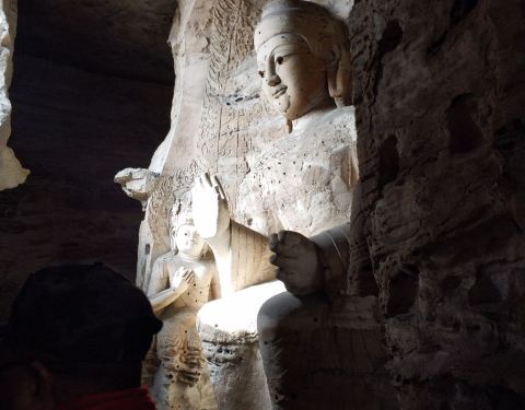 整个石窟群中最大和保存最完好的一个,造像和建筑风格有明显受西方罗马文化的影响,只是前些年缺乏保...整个石窟群中最大和保存最完好的一个,造像和建筑风格有明显受西方罗马文化的影响,只是前些年缺乏保护,附近的道路是煤运专线,被煤尘熏黑了。