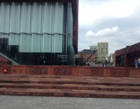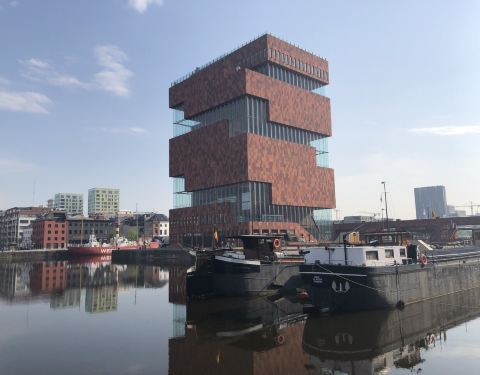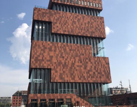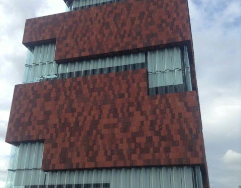 河畔博物馆因为地处斯海尔德河岸,又被称作水上博物馆或河边博物馆,在运河中连接着城市与港口,象征着该城与世界的联系。外观灵感它由荷兰努特林斯·雷代克建筑事务所设计,灵感来源于十六世纪的仓库Hanzehuis,整栋建筑仿佛是用一块块儿方形“盒子”堆积而成,螺旋式的楼梯绕着这些“盒子”旋转而上,为参观者也提供了欣赏城市与港口的新视角。博物馆外墙的红石来自印度,弧线切割的玻璃幕窗高达6米,红石中嵌入的三千铝制手形图案使这座“红塔”在阳光下熠熠发光。博物馆高 60 米,如果攀上顶层的话,能够俯瞰整个城市的美景。参观导览该博物馆共有十层并容纳37万余件藏品:一楼为办公区,二楼主要为视觉储存展示区展示藏品及其历史,三楼是临时展览空间,四楼和五楼是世界人文交流主题展览区,六楼是世界港口城海事展览区,七楼和八楼是生命与死亡主题展览区,九楼是餐厅和接待室,十层为露台观景区。博物馆部分藏品来自比利时国家海事博物馆、民族博物馆和民俗博物馆。