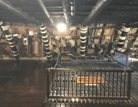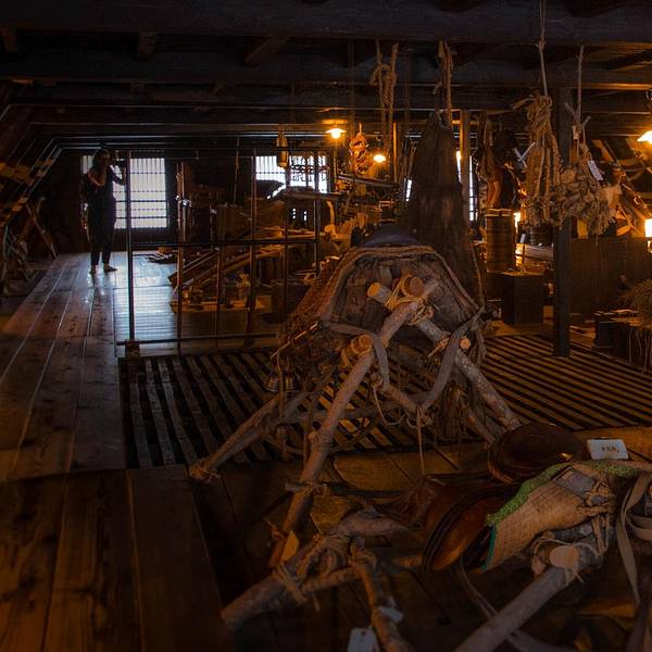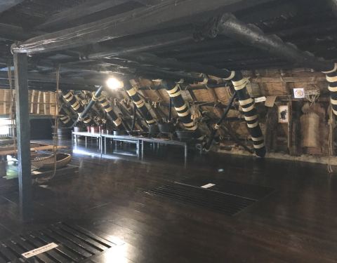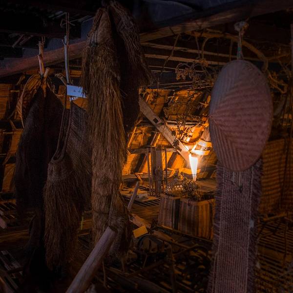 在门口的婆婆哪里买票就可以入内参观,鞋子要脱在玄关,穿着袜子入内。一层作为生活区被划分的很简单,靠近玄关的部分是以前的地炉,把炭火放在中间点燃,暖气流会使得整个屋子都变得暖和起来,在这里除了取暖以外,还会烧水,招待客人吃饭也是在个位置。更重要的是这里还是制作盐硝(制作爆破所需要材料)的地方。围绕地炉的天花板,立柱和墙面都被地炉的煤烟熏成棕黑色,很有年代感。地炉再往里的区域就是类似于起居室的地方吧。