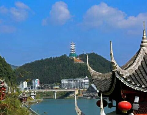 《飞歌米酒献花桥》小江口上浪滔滔,画楼石墩雨潇潇。丹凤朝阳龙抢宝,彩虹飞驾凤凰桥。青山绿水风雨渡,万紫千红溪上漂。铜鼓芦笙山水颂,飞歌一曲献花桥。(七律)