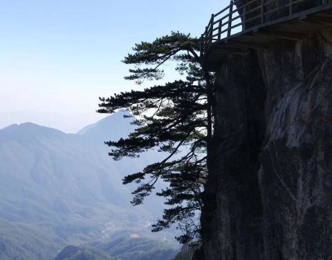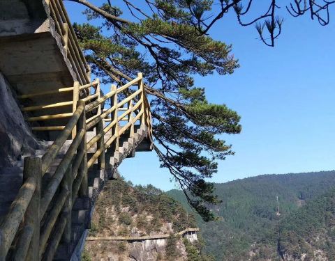 青云栈道位于海拔约1500米的明月山山顶,从观景台走玻璃钢桥至青云栈道,1700米长的悬空栈道横亘于乌云崖峭壁之上,一眼望去,宛如盘云的游龙,尉为状观,崖壁的迎客松和各类灌木点缀其间,移位换景,气象万千,让游人流连忘返。