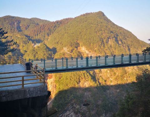 洞穴不大也不长,穿过去后就看见一座同样不长的横跨两山的玻璃桥: