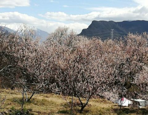 走进如纳村,仿佛来到世外桃源。村子里静悄悄,偶而几声藏犬吠叫,更显村庄的宁静。村庄景致优美,蓝天白云下的雪山升起层层的云雾,道路旁弯弯曲曲篱笆围着畦畦的青稞,在绿油油青稞衬映下,千姿百态的桃花绽放灿烂。 这里的桃花不同于其他地方,田间垄上、纵横阡陌、无一地不是野生桃花的世界。再现古诗中“雨中草色绿堪染,水上桃花红欲然”的景象。