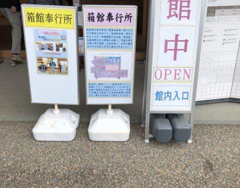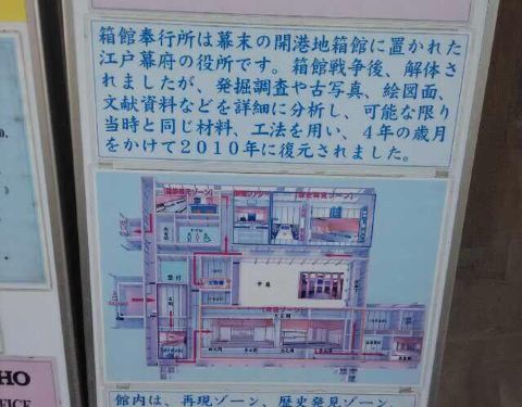 箱馆奉行所位于五棱郭公园的正中心,是由于幕府末期箱馆(今称函馆)港口开放而设置的江户幕府的衙门,始建于安政四年(1857年),戊戌战争后包括奉行所在内的大多数建筑物被拆除,后于2010年完成复原。馆内共分为四个区域:再现区、历史探寻区、影视剧场和建筑复原区。其中,再现区忠实再现了幕府末期的箱馆奉行所,其中包括72张塌塌米大的大房间,展示了日本古建筑的技艺;历史探寻区介绍了箱馆奉行所的历史,包括幕府末期箱馆战争的相关人物介绍;影像剧场主要是播放复原工程的纪录片;而建筑复原区介绍了箱馆奉行所复原工程的各项进展工作。