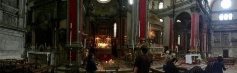 威尼斯的玫瑰圣母堂又称“耶稣会教堂”,是一座18世纪的道明会教堂,濒临威尼斯非常重要水道之一的朱代卡水道。这座古典风格的建筑保留了其原有的布局和华丽的洛可可装饰,拥有Tintoretto、Piazzetta和Tiepolo等多位艺术家的画作。教堂及其几乎所有的雕塑和绘画都是在30年之内完成的:1725年开工,1743年祝圣,1755年雕塑装饰到位。其中宏大而精美的穹顶画出自Tiepolo之手,描绘的是圣道明的生平,是提埃坡罗早期的作品,精美程度令人叹为观止。