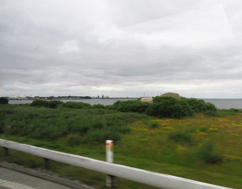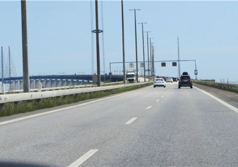 厄勒海峡大桥全程跨度16公里,连接丹麦的哥本哈根和瑞典第三大城市马尔默,于1995年动工,2000年5月完工,是目前世界上已建成的承重量最大的斜拉索桥。大桥从马尔默出发,海峡中建造了一座人工岛,靠近哥本哈根的一段是铁路与公路合用的海底隧道,因此大桥由三部分组成,其中8公里桥梁、4公里人工岛上公路、4公里海底隧道。我们由马尔默乘大巴经厄勒海峡大桥到哥本哈根,由于乘车未停留,所以拍不到全景的图片,但看到了人工岛上的公路、直升机停机坪,经过了海底隧道,到达哥本哈根。
