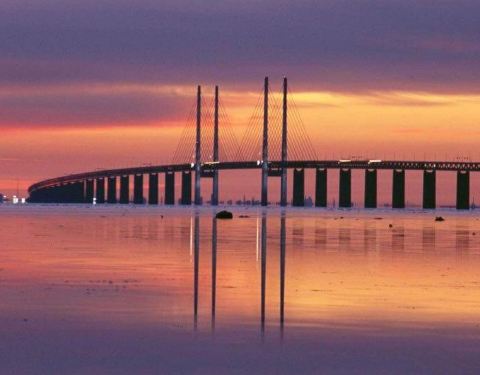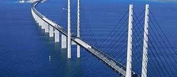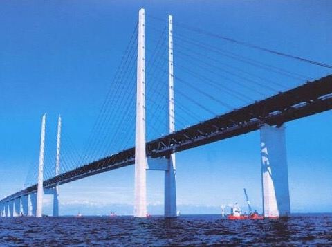 厄勒海峽大橋,也稱歐爾松大橋,非常漂亮,它連接著丹麥的哥本哈根和瑞典的馬爾默。這一海上走廊的建成,將歐洲大陸的中部與北歐的斯堪的納維亞半島連成一體,從而把整個歐洲連接起來。大橋於1995年動工,2000年完工,全程26公里,是目前世界上已建成的承重量最大的斜拉索橋。歐爾松大橋從瑞典馬爾默出發,海峽中建造了一座人工島,靠近丹麥哥本哈根的一段,是鐵路與公路合用的海底隧道,因此,大橋包括了八公里橋樑、四公里人工島上公路和四公里海底隧道。大橋的東橋,建有200米高的中央橋墩和75米高的橋下淨空,保證過往海峽的船隻從橋底順利通過。