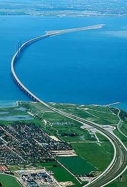 厄勒海峡大桥横跨厄勒海峡,连接丹麦首都哥本哈根和瑞典城市马尔默这两个都会区。厄勒海峡大桥由斜拉跨海大桥和海底隧道两部分组成,8公里长的跨海大桥大部分在瑞典境内,一直到海峡中的Peberholm人工岛(丹麦境内)。往来马尔默和哥本哈根的火车奔驰于大桥之上,十分方便。一般船只从杜洛格敦海峡经过,下方即是海底隧道,遥望厄勒海峡大桥,十分壮观。