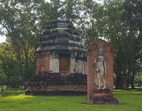 银塘寺在素可泰历史公园池塘的西南面,该寺由大佛塔、会馆和授戒大厅等组成。大佛塔是典型的素可泰风格的建筑,呈莲花状,塔的周围矗立着走佛像或者站佛像,栩栩如生,十分生动。在这里,你可以感受到素可泰古老的历史气息。