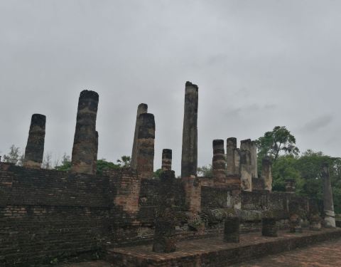 就是在素可泰历史公园东入口偏北的位置。看着规模尚可,不过没什么名气。连进去的路都没有,只能骑着自行车通过草坪过去。目前就剩下基座和几根柱子了了,不过面积还挺大。