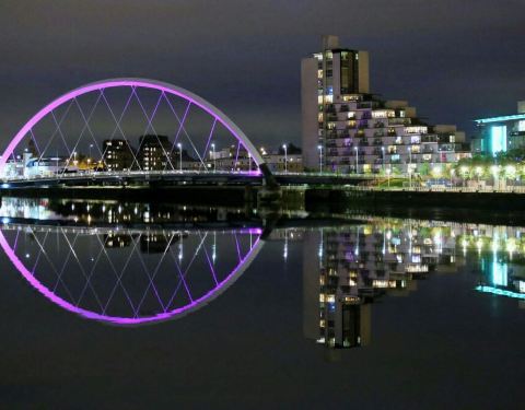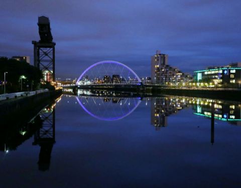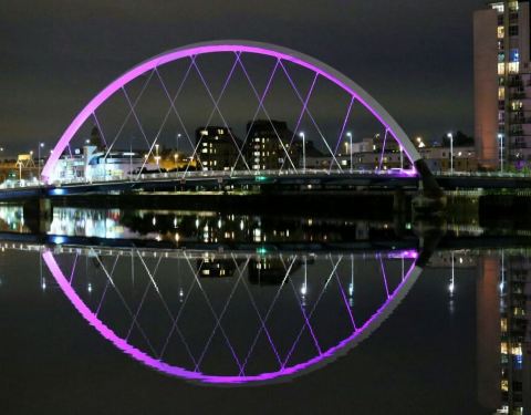 克莱德拱桥位于格拉斯哥市中心,横跨河流两岸,半圆形的拱粱非常的巨大,很有建筑特色,在夜晚拱桥的霓虹打开,不断的变换着颜色,犹如一道彩虹分外美丽。