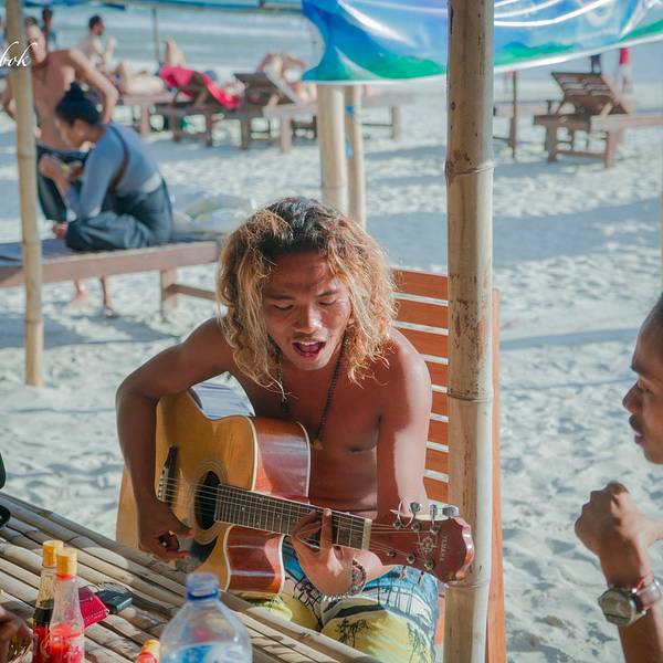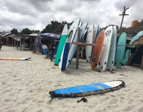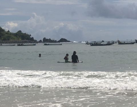 冲浪的海滩,很多冲浪店。好多欧美人学冲浪,东方面孔极少。沙子依然洁白细腻柔软,消费比圣吉吉,T岛低,同样收了我们三人1万盾门票,人民币5元。有吃饭的地方,适合我们躺起发呆,看看冲浪。