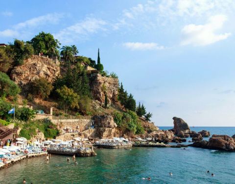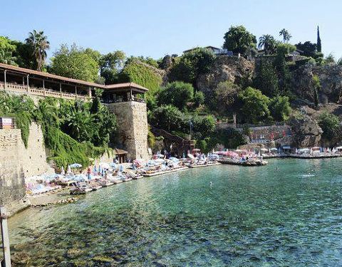 这是一个小型而漂亮的私人海滩,位于安塔利亚老城中心。海水清澈温暖,可以在躺椅上晒日光浴,背后是棕榈树的浓荫;也可以下水游泳或潜水,近岸可见许多小鱼在岩石的缝隙里穿来穿去。这里的餐厅会提供配套的服务。