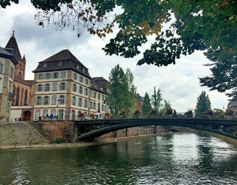 斯特拉斯堡的欧洲桥是一座非常古典的铁架桥梁,它横跨在伊尔河上,绿色的桥身,每隔一米的护栏上就有一盆盛开的鲜花,把桥梁装扮得非常的艳丽多姿,走在桥上充满着欧洲浪漫的风情,真的应该多拍几张照。