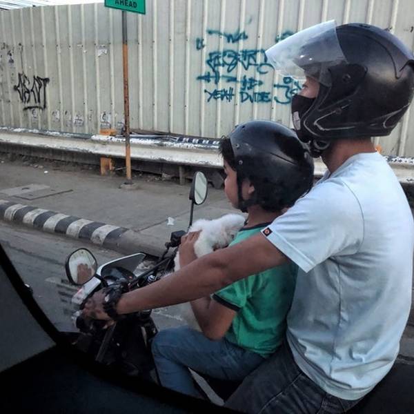 一出飞机场就会有小黑问要不要包车,也了避免第二天凌晨3点从宿务出发去看鲸鲨,所以我们决定今天就到Oslob,所以我们就谈下一辆6座的车出发,中间和你谈价格的是中间商,谈好后会带你去司机那里,总共4500P。(记得要会砍价,小黑一上来和我们要7500P!)路上抱着小狗的小男孩,好像找到自己的新伙伴,很开心的抱着他的狗狗。